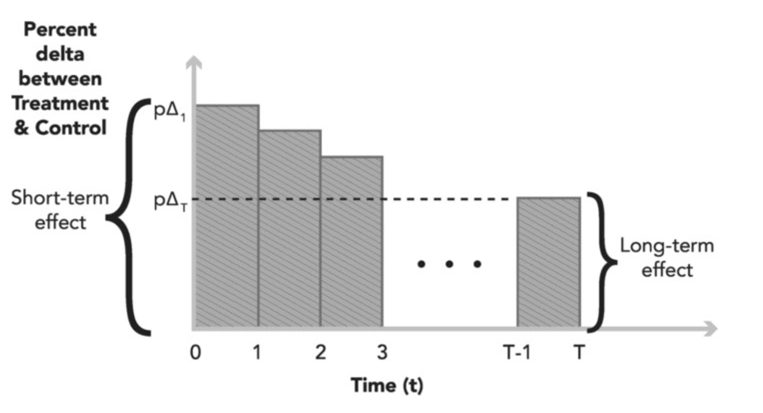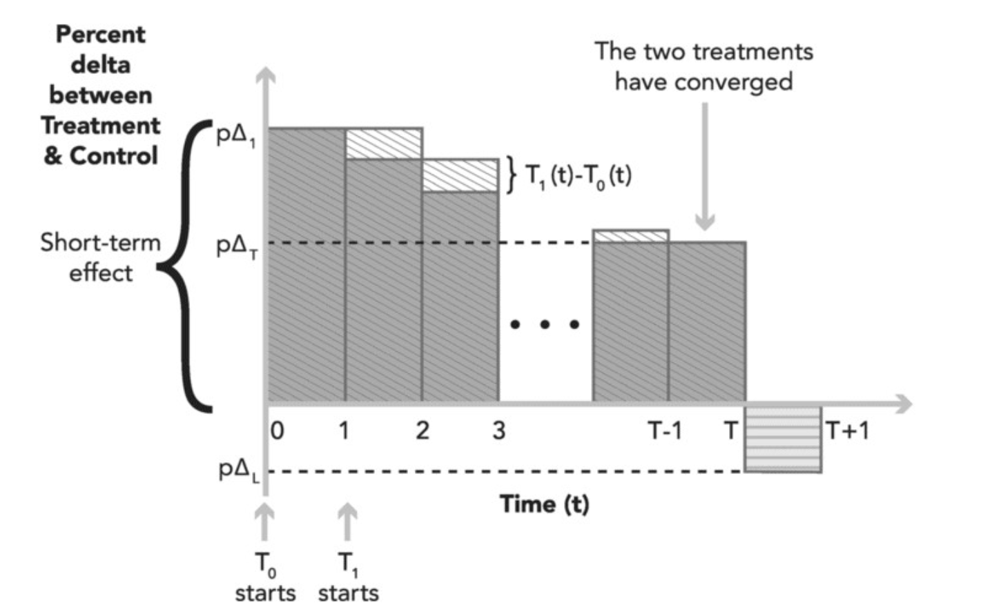 | 实验设计与决策机制类问题 | Long-Term Effects | 如何在短期的实验里测出指标长期的变化避免决策短视? | 短期实验结果预测长期实验结果 | 中高广告侧堂试通过估计学习效应和中间指标推进预试实验长期LTV表规,预测依效结果强依赖于学习效应的趋势 |