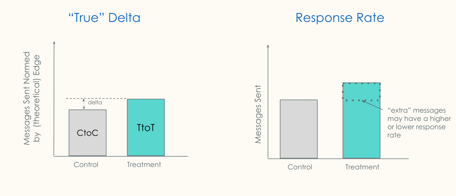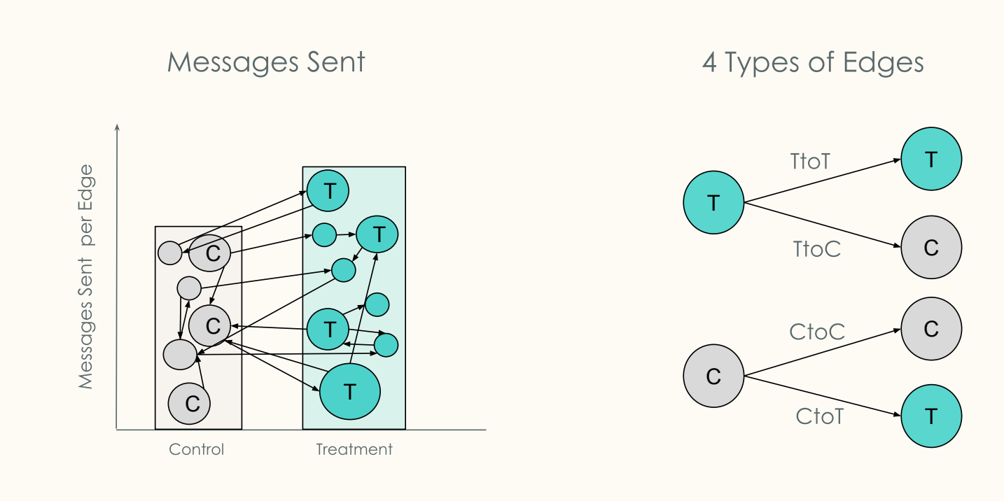 - 对所有的 edges(边)都做好标记之后,在实验进行中我们就可以对以上三种类型的关系分别统计发信息、互动等动作的数量(如果衡量指标是互动量的话),并通过对比「实验组-实验组」、「对照组-对照组」两类 edges 上的互动量来推算出真实的互动量 diff。该方法有一个假设是No treatment affinity,即T-T用户并没有比其他用户更活跃/更不活跃。