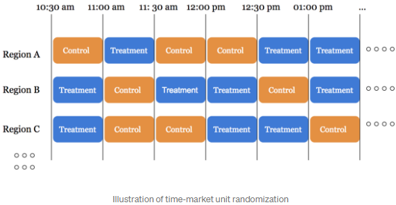 - Switchback testing的核心思想是, 对于某一区域,随时间推移,在实验组和对照组之间交叉切换。即:对于不同的区域设不同时间段分桶,再对其实验组time bucket和对照组time bucket之间的差异,来评估策略效果