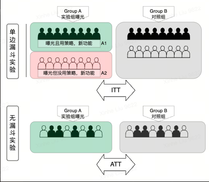 - ITT (Intention-to-treat),估计的是我们意图想要让策略生效(但其中有一部分有主见的用户)的人群,也就是实验组A1+A2整体,的策略人均效果