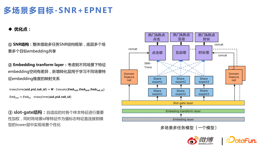 整体结构类似 SNR,顶层设计了点击、互动和时长三个目标塔。这三个目标塔针对热门和热点两个场景,进一步细分为六个具体目标。